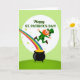This greeting card features a cheerful leprechaun mid-leap inside a bright white circle, his open arms and wide grin giving the scene a friendly, welcoming feel 💚. He wears an emerald green coat and tall hat with shiny gold buckles, and his orange hair and beard add a warm contrast against the soft green background. A rainbow 🌈 curves in from the upper left and leads the eye down to a black pot packed with gold coins near the bottom of the design. The pot sits on a darker patch of jagged grass, creating a cozy little “stage” that frames the lucky treasure. Scattered light-green starbursts dot the background around the circle, like tiny sparks that make the moment feel a bit more special. Inside the white circle, the message “Happy ST. PATRICK’S DAY!” appears prominently, with “Happy” above and “ST. PATRICK’S DAY!” larger below in dark lettering that stands out clearly. The leprechaun’s joyful pose and the rainbow-to-gold path pair nicely with the message, like an invitation to share a laugh with someone close. The scene is anchored by the white circle at center, the rainbow sweeping diagonally from the top left, and the coin-filled pot resting near the lower edge on the dark grass.