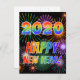 This postcard design features the messages "2020" and "HAPPY NEW YEAR!" on the front, having rainbow spectrum gradient colored letters, along with a bursting fireworks inspired pattern. The back features a customizable message.