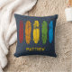 Add a personalized touch to beds and couches or create a unique personalized gift that's perfect for longboard riders. This personalized throw pillow features distressed style illustrations of skateboards in rainbow colors against a navy blue background with your name or message in yellow print lettering.