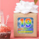 This vibrant, exciting, and eye-catching birthday-themed sticker design features a blue sky with clouds pattern background, a large number "19" and "HAPPY BIRTHDAY," both having a multicolored rainbow spectrum inspired gradient pattern, and a custom name. Happy and fun stickers like this might be used when wrapping gifts being given to somebody who is celebrating their nineteenth birthday. [~Z0000374]