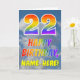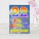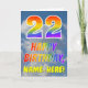 This fun and colorful 22nd birthday greeting card design features a depiction of a cloudy blue sky, along with a large number "22" and the message "HAPPY BIRTHDAY," having a rainbow spectrum inspired gradient pattern coloring, on the front. The front also features the custom name of the card’s recipient. The inside features an editable birthday greeting message, or could perhaps be cleared and left blank if a message is to be written by hand instead. A custom birthday card like this might be a fun way to send birthday wishes to somebody who is celebrating their twenty second birthday. [~Z0000371]
