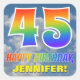 This exciting, fun, and eye-catching birthday-themed sticker design features a cloudy blue sky pattern background, a large number "45" and "HAPPY BIRTHDAY," both having a multicolored rainbow spectrum inspired gradient pattern, and a personalized name. Fun and colorful stickers like this might be used when wrapping gifts being given to somebody who is celebrating their forty fifth birthday. [~Z0000374]