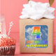 This eye-catching, fun, and vibrant birthday-themed sticker design features a blue sky with clouds pattern background, a large number "4" and "HAPPY BIRTHDAY," both having a multicolored rainbow spectrum inspired gradient pattern, and a customizable name. Fun and colorful stickers like this might be given as a gift to somebody who is celebrating their fourth birthday. [~Z0000374]