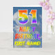 This fun and colorful 51st birthday greeting card design features a depiction of a blue sky with clouds, along with a large number "51" and the message "HAPPY BIRTHDAY," having a rainbow spectrum inspired gradient pattern coloring, on the front. The front also features a customizable recipient name. The inside features a customizable birthday greeting message, or could perhaps be cleared and left blank if a message is to be written by hand instead. A custom birthday card like this might be a fun way to send birthday wishes to somebody who is celebrating their fifty first birthday. [~Z0000371]