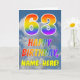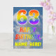 This fun and colorful 63rd birthday greeting card design features a representation of a blue sky with clouds, along with a large number "63" and the message "HAPPY BIRTHDAY," having a rainbow spectrum inspired gradient pattern coloring, on the front. The front also features the editable name of the card’s recipient. The inside features a personalized birthday greeting message, or could perhaps be cleared and left blank if a message is to be written by hand instead. A personalized birthday card like this might be a fun way to acknowledge somebody’s sixty third birthday. [~Z0000371]