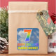 This vibrant, fun, and eye-catching birthday-themed sticker design features a cloudy blue sky pattern background, a large number "7" and "HAPPY BIRTHDAY," both having a multicolored rainbow spectrum inspired gradient pattern, and a custom name. Colorful and happy stickers like this might be used when wrapping presents being given in celebration of somebody’s 7th birthday. [~Z0000374]