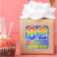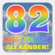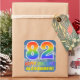 This eye-catching, fun, and vibrant birthday-themed sticker design features a cloudy blue sky pattern background, a large number "82" and "HAPPY BIRTHDAY," both having a multicolored rainbow spectrum inspired gradient pattern, and a custom name. Colorful and fun stickers like this might be used when wrapping presents being given in celebration of somebody’s eighty second birthday. [~Z0000374]