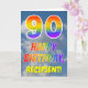 This fun and colorful 90th birthday greeting card design features a depiction of a cloudy blue sky, along with a large number "90" and the message "HAPPY BIRTHDAY," having a rainbow spectrum inspired gradient pattern coloring, on the front. The front also features the custom name of the card’s recipient. The inside features an editable birthday greeting message, or could perhaps be cleared and left blank if a message is to be written by hand instead. A customizable birthday card like this might be a fun way to send a message in celebration of somebody’s ninetieth birthday. [~Z0000371]