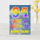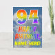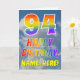 This fun and colorful 94th birthday greeting card design features a representation of a blue sky with clouds, along with a large number "94" and the message "HAPPY BIRTHDAY," having a rainbow spectrum inspired gradient pattern coloring, on the front. The front also features the personalized name of the card’s recipient. The inside features a personalized birthday greeting message, or could perhaps be cleared and left blank if a message is to be written by hand instead. A personalized birthday card like this might be a fun way to send birthday wishes to somebody who is celebrating their ninety fourth birthday. [~Z0000371]