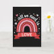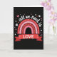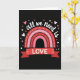 This card features a black background with a stylized rainbow made from layered arcs of reds and pinks, each marked with small white dashed lines like gentle paths leading inward. Above the rainbow, the words “all we need is” curve across the top in thin white lettering, giving the phrase a light, floating look. Beneath the arcs, a deep red ribbon banner stretches across the center, and the word “LOVE” sits on it in crisp white uppercase letters ❤️. Tiny hearts scatter around the main design—some filled in pink, others shown as simple white outlines—like little sparks circling the message 🥰. The tight color range keeps your eyes on the warm reds and soft pinks, making the layout feel close and affectionate without adding extra clutter. The banner’s folded ends add a small sense of depth, as if it’s gently wrapped around the message. Small pink hearts and white-outlined hearts are sprinkled around the rainbow against the dark background.