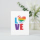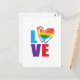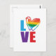 Gay pride themed card features large colorful LOVE typography with rainbow scribble heart