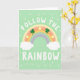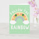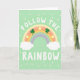 This greeting card shows a soft rainbow arcing across the center, with pastel bands of pale yellow, soft orange, blush pink, and light lavender rising from puffy white clouds. The background is mint green with tiny white polka dots scattered like confetti, giving the scene a light, festive look ☘️. Two rich green shamrocks sit near the top of the rainbow, close together as if sharing a quiet moment, adding a gentle hint of friendship and closeness 💚. The phrase “FOLLOW THE RAINBOW” appears in white sans-serif letters that curve with the rainbow, with “FOLLOW” and “THE” placed above and “RAINBOW” set below. The letters are slightly uneven in shape, which makes the wording feel friendly and inviting rather than formal. Soft shading around the clouds and rainbow keeps everything airy, while the shamrocks stand out with deeper green tones. The mint background, dotted with small white circles, frames the rainbow and the two shamrocks perched at the highest arc.
