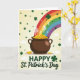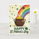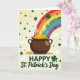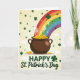 This greeting card shows a rounded brown pot sitting low in the center, stuffed with shiny gold coins that spill slightly around its base. Thin white curls of steam rise from the treasure, as if the pot was just found and someone leaned in close to admire it 💚. A rainbow sweeps in from the upper right and drops its colored bands straight into the pot, like a classic lucky find shared between friends ☘️. Behind everything is a creamy yellow‑green gradient that feels like early spring, with dark green shamrocks floating at different sizes across the scene. Soft white clouds drift near the top, giving the background a light, airy look. Near the bottom, the text reads “HAPPY St. Patrick’s Day,” with “HAPPY” in dark green uppercase and “St. Patrick’s Day” in flowing green lettering, plus a shamrock accent nearby. Extra coins glint around the pot’s base, and the rainbow’s end lines up neatly with the opening of the pot.