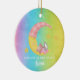 Forever in our hearts memorial ornament featuring a bear with angel wings on a moon. Personalized with the year and the baby's name. It includes a baby with pink clothes, stars, and a rainbow background. If you want to change the colors or font of the text please click the button to edit the design.