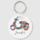 This personalized keychain is perfect for keeping the keys to your moped secure. The custom keychain features an illustration of a classic motorized scooter in bright, rainbow colors in a fun painted style. Your name is below in modern black, script lettering. This keychain makes a fun gift for new scooter owners.