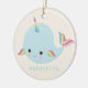 This fun custom ornament features a cute kawaii rainbow narwhal pattern in pastel blue and pink. Personalize it with your name. Great gift idea.
