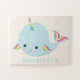This fun custom puzzle features a cute kawaii rainbow narwhal pattern in pastel blue and pink. Personalize it with your name. Great gift idea.