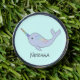 A happy rainbow narwhal on a sea blue background with space for a custom name.