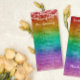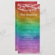 Colorful gay wedding program featuring glowing string lights against a dark watercolor rainbow ombre. Rainbow wedding program with string lights.