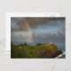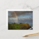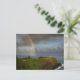 Postcard of a rainbow under some dark gray rain clouds over Kilauea Lighthouse on a big rock in the Pacific Ocean on the North Shore of Kauai, Hawaii, USA.