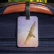 A luggage tag featuring a barn own with a textured rainbow background. Personalize this owl luggage tag with the contact information you want to include, such as you name, phone number, and email address.