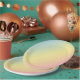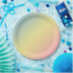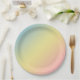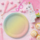 A rainbow full of pastel colors decorate this set of paper plates. Colors of pink, green, blue, yellow, light purple etc. Also available in matching napkins, and kitchenware accessories. Great for a picnic on a beautiful day.