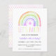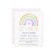 Customizable rainbow birthday party paper invitation, featuring a colorful rainbow and polka dots, in tones of violet, blue, purple, yellow, orange, green and pink on a background of clean white. This is an affordable paper invitation. You are welcome to visit our store Peony Designs to purchase this invitation on card or as a downloadable digital.
