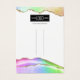 Modern bow hair accessory display cards featuring a white background with trendy pastel rainbow agate edges, your business logo, social media icons that can be removed, and your company details.