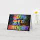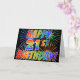 The front of this eye-catching, vibrant and fun greeting card design features a colorful pattern inspired by celebratory fireworks, along with the message "HAPPY 21ST BIRTHDAY!" having a multicolored rainbow like gradient pattern, on a black colored background. The inside features a personalized greeting message, or could perhaps be cleared and left blank if a message is to be written by hand instead. A greeting card like this might be a fun, happy way to acknowledge somebody’s twenty first birthday. [~Z0000355]