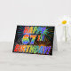 The front of this eye-catching, exciting and fun greeting card design features a colorful celebratory fireworks inspired pattern, along with the message "HAPPY 67TH BIRTHDAY!" having a multicolored rainbow like gradient pattern, on a black colored background. The inside features a personalized greeting message, or could perhaps be cleared and left blank if a message is to be written by hand instead. A greeting card like this might be a happy, fun way of sending a greeting message to somebody who is celebrating their sixty seventh birthday. [~Z0000355]