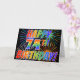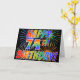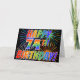 The front of this exciting, vibrant and eye-catching greeting card design features a colorful pattern inspired by celebratory fireworks, along with the message "HAPPY 74TH BIRTHDAY!" having a multicolored rainbow like gradient pattern, on a black colored background. The inside features a personalized greeting message, or could perhaps be cleared and left blank if a message is to be written by hand instead. A greeting card like this might be a happy, fun way to acknowledge somebody’s 74th birthday. [~Z0000355]