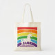 Rainbow Pattern White Unicorn Personalized Pretty Kids Tote Bag. Red, orange, yellow, green, blue and purple colors in a sweeping pattern across the front of this bag. A pretty silhouette of a white unicorn in the center below name. Personalize with name in white font to customize.