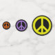 Celebratory peace signs on a black background in a rainbow of colors. Pink, orange, yellow, green, blue, and purple.