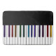 Rainbow Piano Keyboard Music Bedspread Bath Mat Rug. A beautiful piece for your piano music themed bedroom suite or studio, or a gift for your favorite pianist, musician or music lover. Classic white piano keys with the dark keys in shades of blue, purple. gold. pink and green offset with black. See the whole rainbow piano home decor and bed and bath suite.