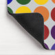 This custom mouse pad features rows of rainbow colored polka dots on a gray background. The gray has an almost metallic feel to it. The offset rows form diagonals of each color: violet, indigo, blue, green, yellow, orange, and red.