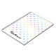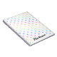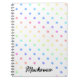 This cute custom notebook features a colorful design. Rainbow polka dots are printed across the front over a white background. A sample name is printed near the bottom which you can personalize to include your own custom name or text.