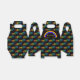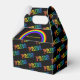 This favor box has black background with the word "PRIDE" in rainbow colors, forming a pattern. On the front side of the box, there is a black panel with a rainbow and an area to ad custom text.