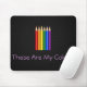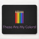 Mousepad with pencils in the colors of LGBT (lesbian, gay, bisexual, and transgender people) rainbow stripes flag, gay pride lgbtqiap+ design, "These Are My Colors" template text, by pinkbrickroad