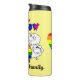 ThisThermal Tumbler features a flock of whimsical sheep. There are five white sheep and one with the colors of the LGBTQ flag. The text on the the reads, 'I'm The RAINBOW Sheep Of The Family.' This design wraps around the front and two sides of the tumbler. On the back there's a heart with the colors of the Rainbow flag. The background color can be customized.