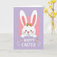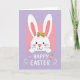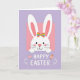 This design shows a stylized white bunny 🐰 leaning its head and front paws over a soft bubblegum‑pink rectangular frame, as if peeking in to greet someone close. Its long ears rise into a calm lavender background, with pale pink inner ear details that add a gentle, affectionate touch. The bunny’s wide dark eyes, tiny rosy nose, and faint blush marks pair with a small smile that reads like a friendly, caring glance. A rainbow-colored bow sits between the ears, adding a cheerful splash of color against the pastel scene. Centered beneath the bunny, the words “HAPPY EASTER” appear in rounded white letters, set against the lavender area for easy reading. On both sides of the text are two decorated oval egg shapes 🐇, filled with pinks, blues, yellows, and reds, patterned with dots and stripes. Thin curling flourishes in a light tone loop around the lettering, while soft shadows give the bunny and frame a layered cut-paper look.