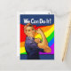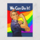 The retro classic WWII era Rosie the riveter "we can do it" image is a traditional icon for strong women. She is shown here against a wavy rainbow colored background