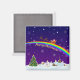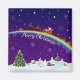 Beautiful snowscape on Christmas night with Christmas trees, houses, a snowman, a church, and Santa Claus flying over a rainbow in the night sky with snowflakes.