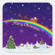 Beautiful snowscape on Christmas night with Christmas trees, houses, a snowman, a church, and Santa Claus flying over a rainbow in the night sky with snowflakes.