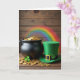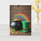Designed with a cozy St. Patrick’s Day still life, the scene centers on a glossy black cauldron tipped forward as gold coins tumble across a worn wooden tabletop. A deep emerald leprechaun hat rests nearby, its black band and gold buckle catching the same warm glints as the scattered coins. Nestled among the treasure, a small three-leaf shamrock leans outward like a quiet token you’d tuck in for a close friend 💚. Soft, diffused light smooths the metal shine and brings out the felt texture of the hat, while the table’s grain looks gently weathered and familiar. In the background, a faint rainbow curves across a wall of wooden planks, adding a dreamy touch without stealing focus 🌈. The greeting “Happy St. Patrick’s Day” appears near the top in light gold lettering, and a smaller line of text sits along the bottom in green. Share St. Patrick's Day sentiments with someone special, as a soft rainbow arc glows behind the cauldron against the warm plank wall.