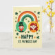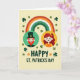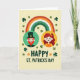Designed with a soft, creamy background, this St. Patrick’s Day card features a rainbow arching across the top in orange, white, and emerald green 🌈. Beneath the rainbow sit two circular portraits that feel like friendly companions leaning into the celebration together. On the left, a leprechaun-like man with a bright red beard wears a green top hat with a golden buckle, set inside a cool teal circle, his rosy cheeks and wide grin turned toward the other portrait 💚. On the right, a smiling woman with flowing reddish-brown hair and a sunny yellow bow appears inside a golden-yellow circle, her warm expression balancing his. Dark green shamrocks scatter across the background, mixing three- and four-leaf shapes like confetti around the pair ☘️. Along the lower section, the phrase “HAPPY ST. PATRICK’S DAY” is placed in large, rounded dark green letters, easy to spot at a glance. One small orange shamrock is tucked into the wording, echoing the rainbow’s orange band with a bright little accent.