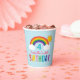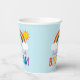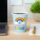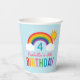 This cheerful girls birthday party paper cup features a bright rainbow with sun and clouds above bold, colorful "Birthday" text on a soft light blue background. The customizable age number and name add a fun personalized touch to your party table. A bright, festive choice for a rainbow-themed girls birthday celebration. All text is fully customizable.