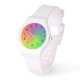 Here is a colorful watch with an abstract spiral rainbow pattern swirling around a central target in spectrum colours of green, blue, yellow, orange and red.