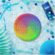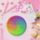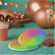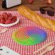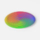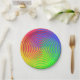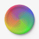 Here is a set of colorful paper plates with an abstract spiral rainbow pattern swirling around a central target in colours of green, blue, yellow, orange and red.