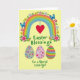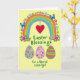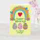 Designed with a soft pastel palette on a creamy background, this illustration centers on a wide rainbow arching across the top like a gentle bridge. Small spring flowers in pink, yellow, and blue, with fresh green leaves, sprinkle along the rainbow, adding a sweet, friendly touch 🌷. Two blue butterflies hover on either side near the upper corners, their wings detailed to suggest a fluttering pause in midair. Hanging from the rainbow’s peak is a red heart, placed like a quiet sign of affection between close friends. Beneath the arc, a seasonal greeting appears in green, flowing lettering across the middle-lower area. Along the bottom sit three decorated egg shapes: one in soft gray with scattered colorful floral motifs, one in pink with tiny hearts and blossoms 🐰, and one striped in bright mixed colors. The stripes on the rightmost egg run in neat horizontal bands of alternating tones.