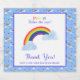 Send your baby shower guests home with this adorable and sweet blue and rainbow raindrop themed custom mini sparkling wine bottle label that reads "Pop it when she pops!" The label is customizable, to edit the text click "personalize this template". This custom sparkling wine label features a hand drawn rainbow raindrop pattern background and a hand drawn illustration of a rainbow and clouds. This makes for a fun and unique baby shower party favor and take home gift!